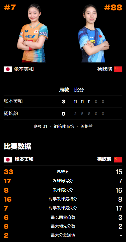 比赛开始后,杨屹韵在首局就打得非常被动,上来就连丢6分,其削球旋转不足以给张本美和制造太大威胁,追回2分后又以2-10落后被对方拿到8个局点,再输1分后以2-11惨败先丢一城,基本找不到能突破张本美和的方法。